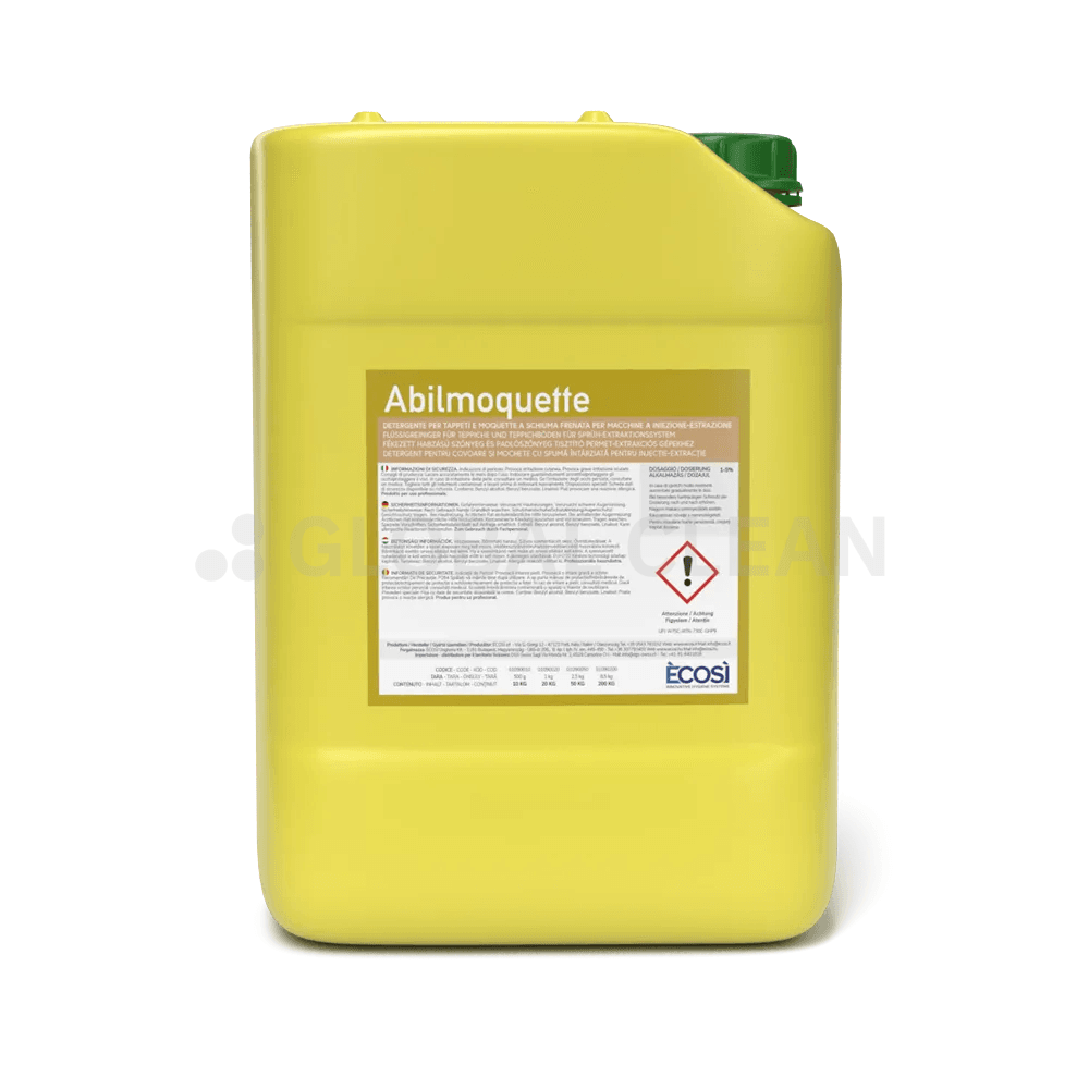 ABILMOQUETTE è un detergente professionale indicato per il lavaggio di tappeti e moquette. Idoneo anche per moquette molto delicate, divani in stoffa e tessuti colorati. I suoi componenti a schiuma frenata ne consentono l’utilizzo sia manualmente che con macchine a iniezione-estrazione.
