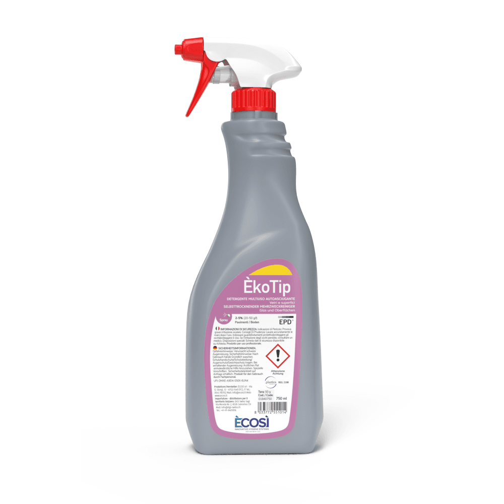 ÈKOTIP è un detergente per la manutenzione di mobili, specchi, vetri e attrezzature. Rimuove efficacemente impronte e tratti di inchiostro, tracce di grasso e sporco da tutte le superfici lavabili. Rispetta le cromature e le parti metalliche come alluminio, ottone o acciaio inox.