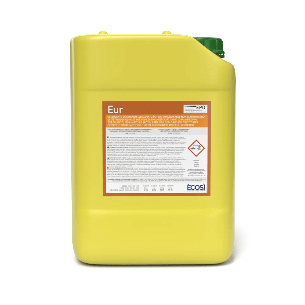 EUR è un detergente certificato EPD che consente di pulire ed emulsionare oli minerali e organici da superfici e pavimenti con estrema efficacia. Idoneo per la pulizia di tutte le attrezzature e i piani di lavoro della cucina. Indicato inoltre per la pulizia di pavimenti molto sporchi, arredi, controsoffitti, moquette sintetiche e ingiallimenti da nicotina e smog.